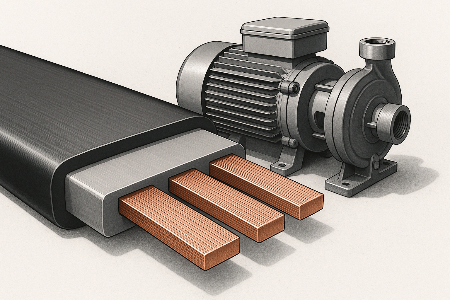 Tipik bir düz pompa kablosu üç katmandan oluşur: iletkenler, yalıtım ve bir dış kılıf veya bant. İletkenliği korurken kabloyu esnek tutmak için iletkenler genellikle çok telli bakırdır. Yalıtım malzemeleri sıcaklığa ve kimyasala maruz kalma gereksinimlerine göre değişir. Yaygın yalıtım seçenekleri, ekonomi için polivinil klorür (PVC), gelişmiş esneklik için termoplastik elastomer (TPE) ve daha yüksek sıcaklık ve aşınma direnci için çapraz bağlı polietilendir (XLPE). Dış kılıf veya bant, aşınma direnci, yağ direnci ve su yalıtımı için seçilen polyester, poliüretan veya arkası yapışkan PVC olabilir.